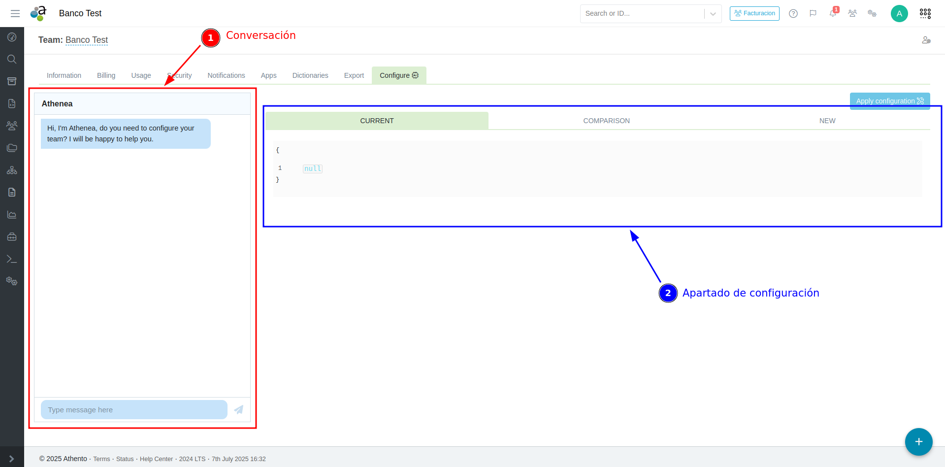 Respecto al apartado de conversación, iremos conversando con Athenea e iremos refinando nuestra configuración para conseguir el resultado esperado. Athenea nos responderá con un JSON de configuración y una explicación del mismo. El JSON de configuración generado por Athenea podremos verlo en el apartado de configuración.