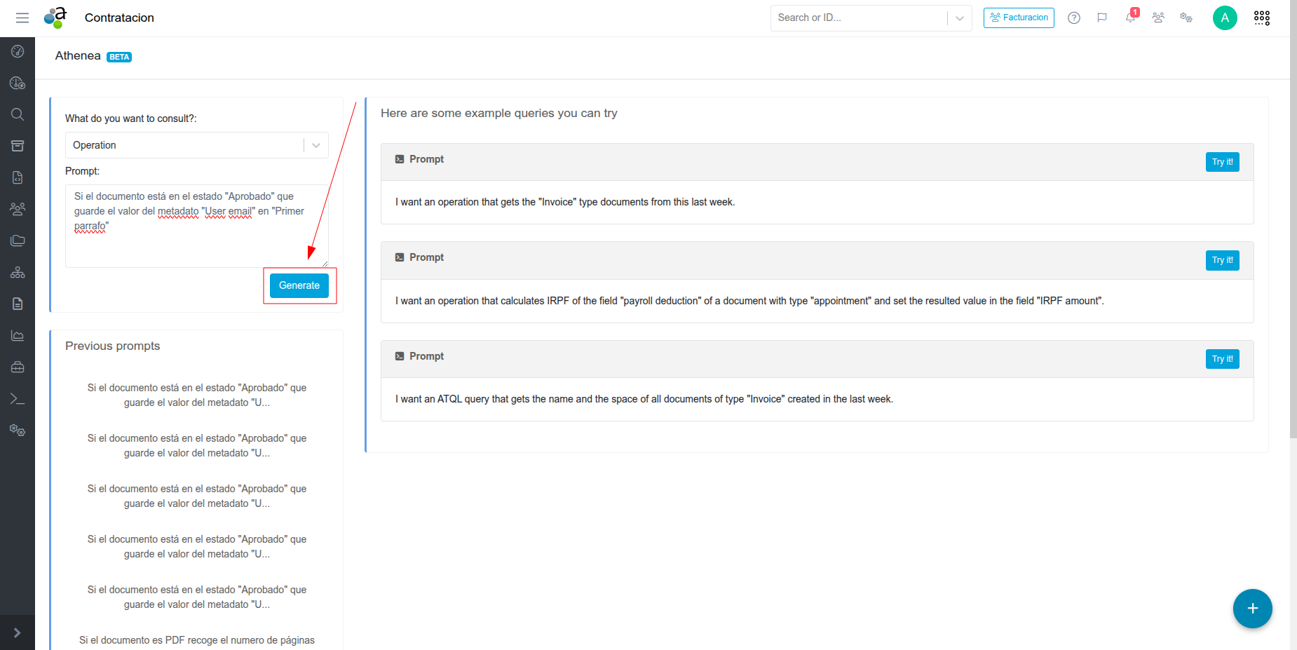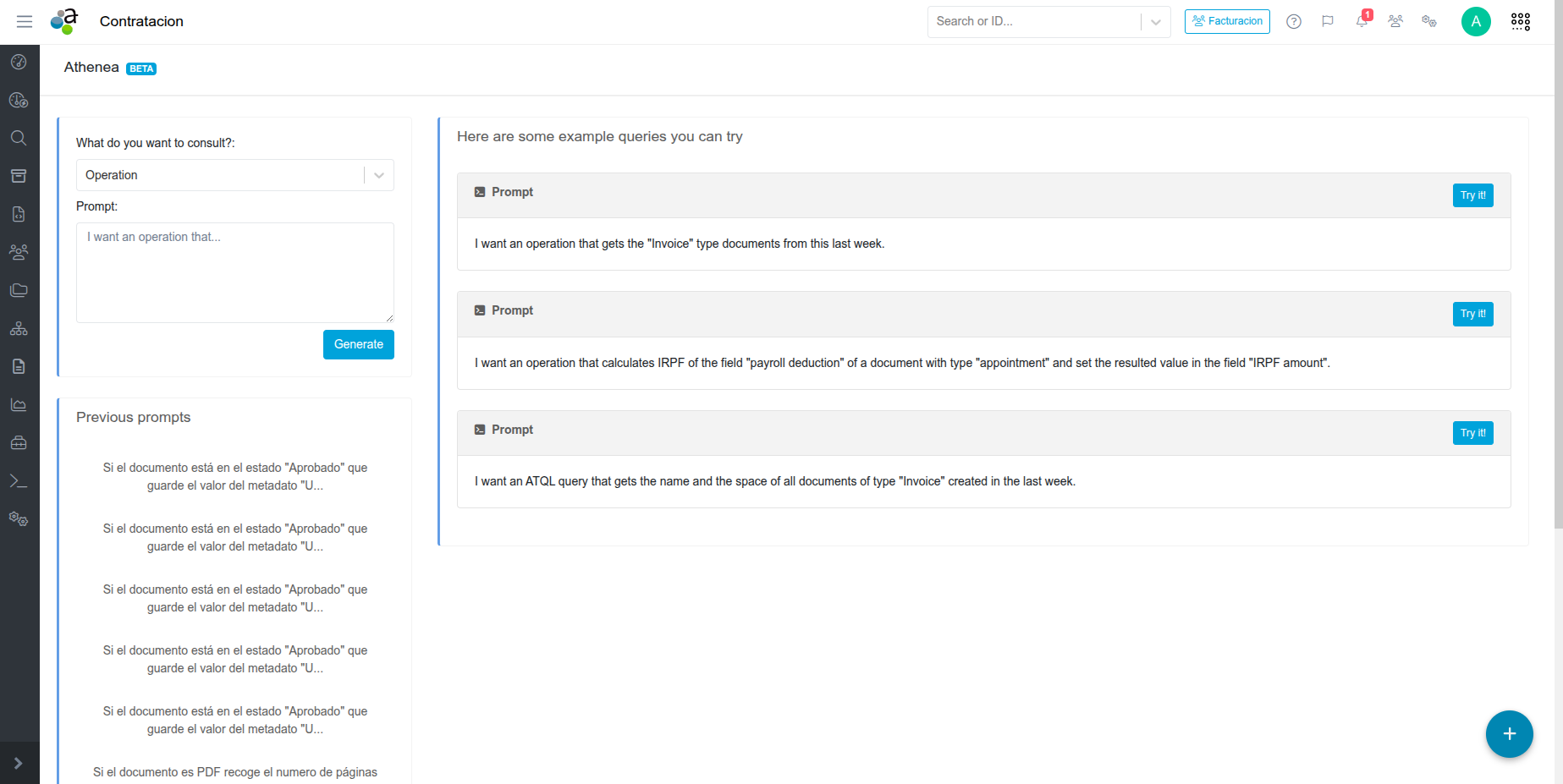 Tras especificar el mensaje, si pulsamos el botón "Generar", Athenea generará una operación haciendo uso del contexto del espacio y del mensaje introducido.