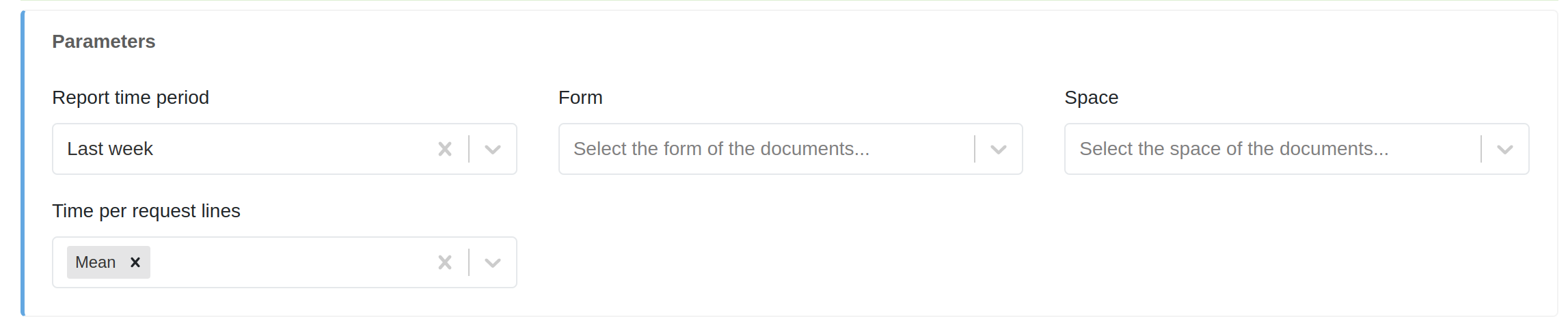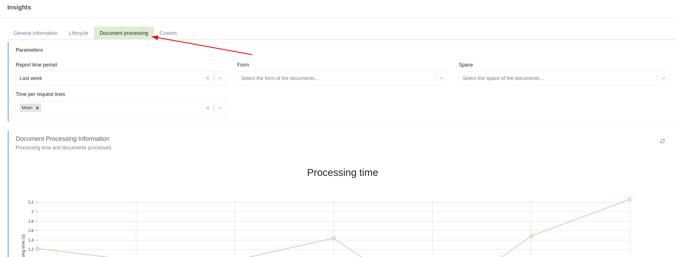 En esta pestaña podremos tiempo medio de procesamiento y la cantidad de documentos procesados en un periodo de tiempo (Último año, último mes, última semana o último día). Además permite filtrar por espacio, formulario y añadir varias líneas a la gráfica de tiempo por petición (Media, tiempo medio de espera, mediana, percentil 90, 95 y 99, mínimo y máximo).