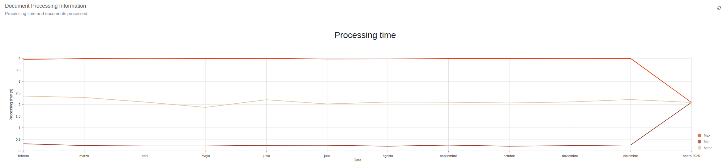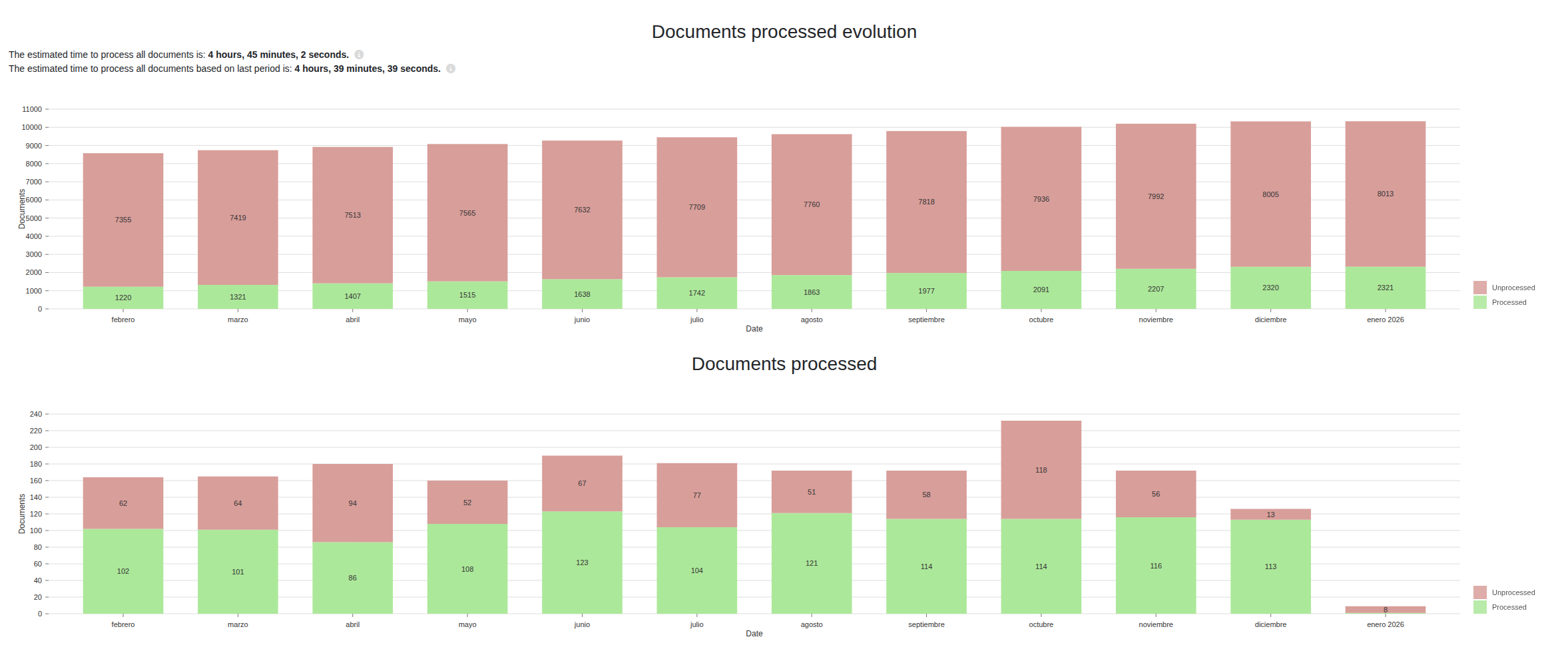 Una vez seleccionadas las opciones veremos los datos en la parte inferior. Para los documentos procesados hay gráficas tanto para el procesamiento por intervalo como su histórico.