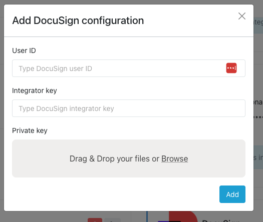 Deberás rellenar el User ID (de un usuario con rol de Sender que será el solicitante de la o las firmas), el Integrator key y adjuntar un .txt con la Private key. Para sacar estos datos, debes tener una cuenta de administrador en DocuSign y crear otro usuario que tenga el rol de Sender.
