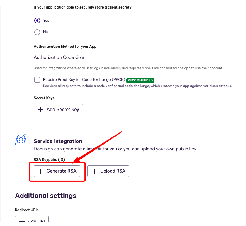 Desde la misma pestaña de edición en la que copiaste el Integration key, en la sección "Service Integration", debes generar unas claves RSA.