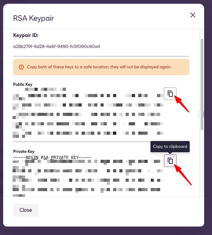En principio solo utilizarás la privada, pero copia ambas por si a caso porque no podrás volver a ver esta pestaña. Cada una en un .txt separado.