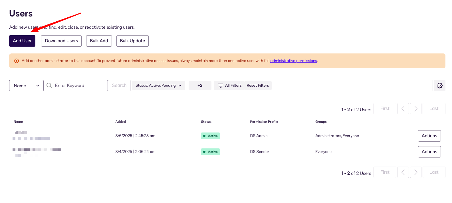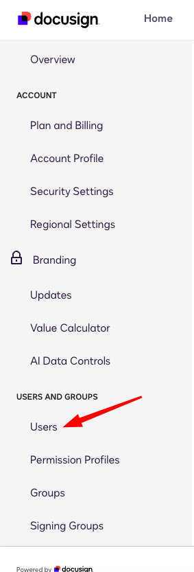 Para ello debes ir a https://apps.docusign.com/admin/users (o https://apps-d.docusign.com/admin/users si estás en el modo sandbox desarrollador) y añadir un nuevo usuario.