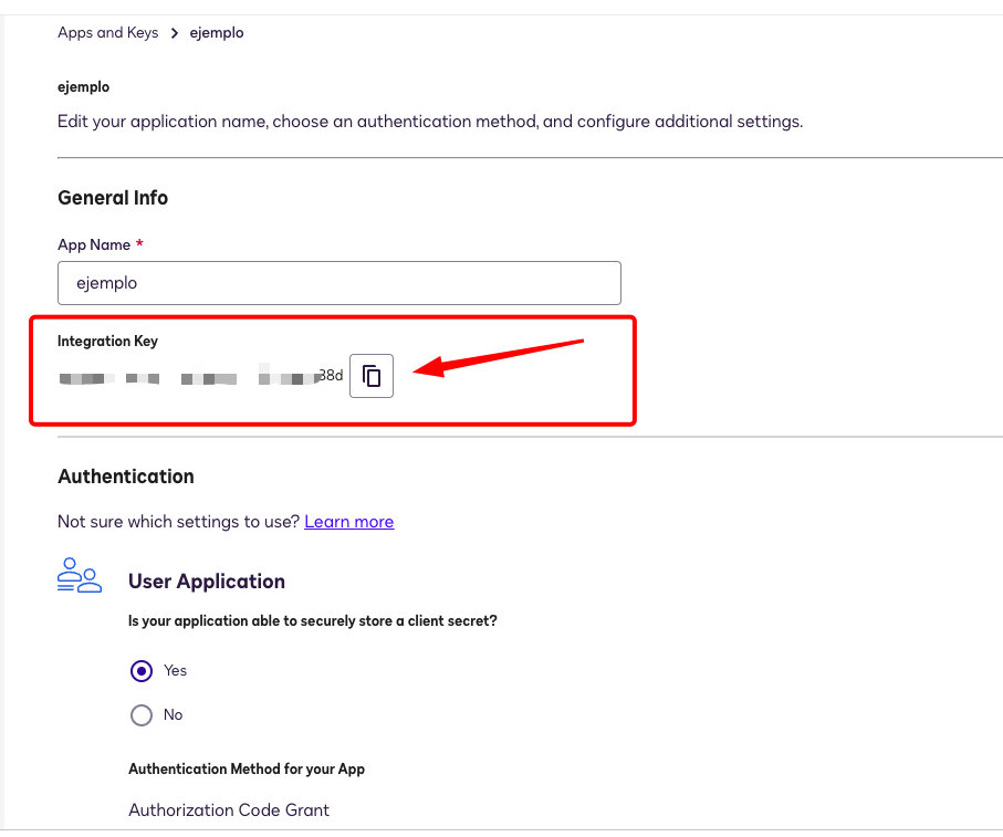 Una vez creada, debes copiar el Integration Key de la sección "General Info":