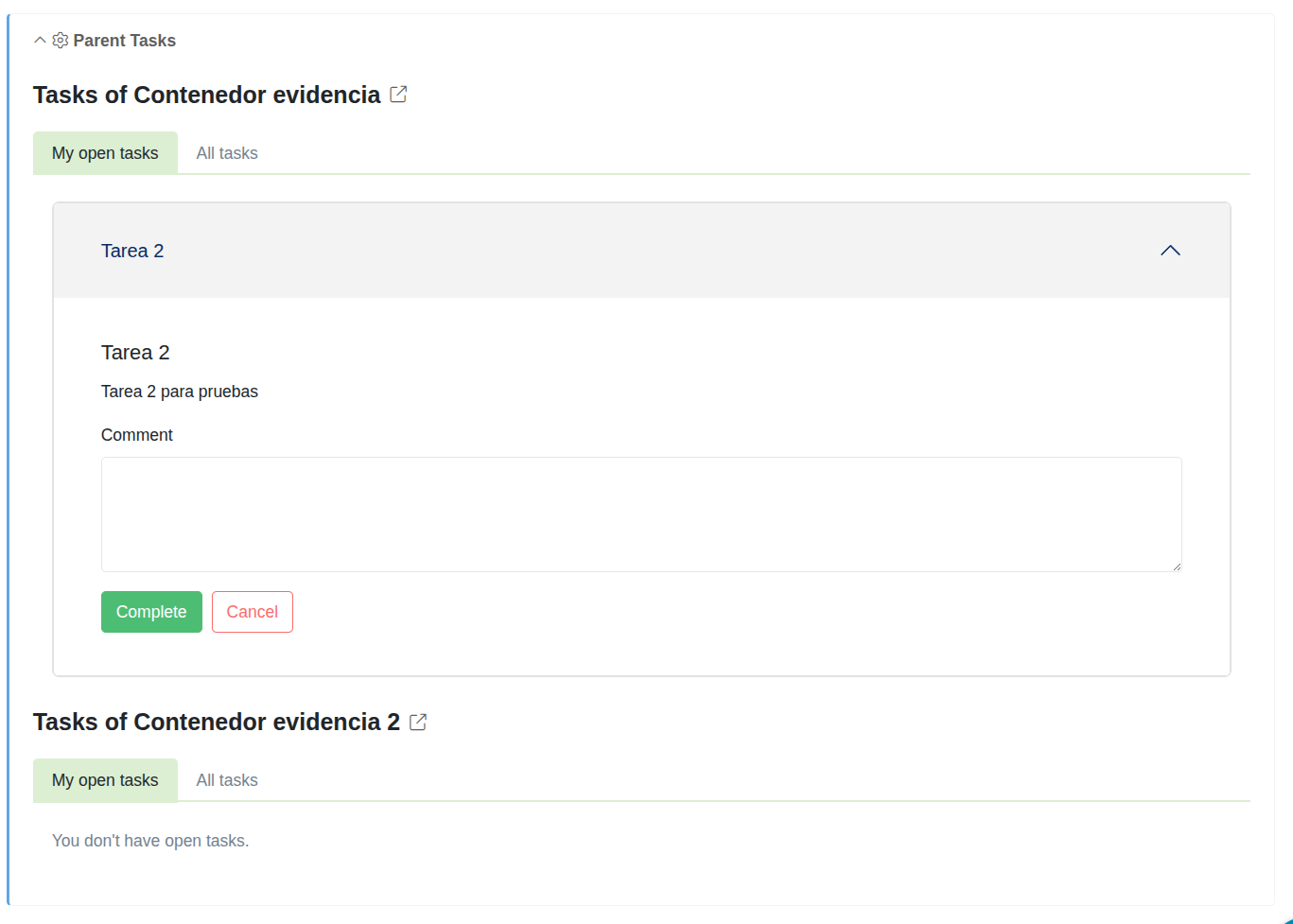 Luego, en caso que el documento tenga documentos padre, se muestra el panel en el documento. Dentro del mismo se muestran las tareas para cada uno de los documentos padre que existan, dando la posibilidad de completar las tareas abiertas dentro del propio panel: