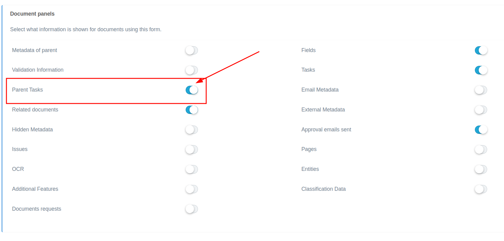 Es posible activar la visualización del panel de tareas de los documentos padre en la vista de un documento hijo. Para ello, desde el tipo documental del documento hijo debes habilitarlo en la sección de paneles de documentos a través del siguiente botón: