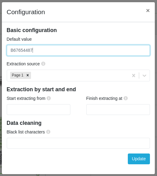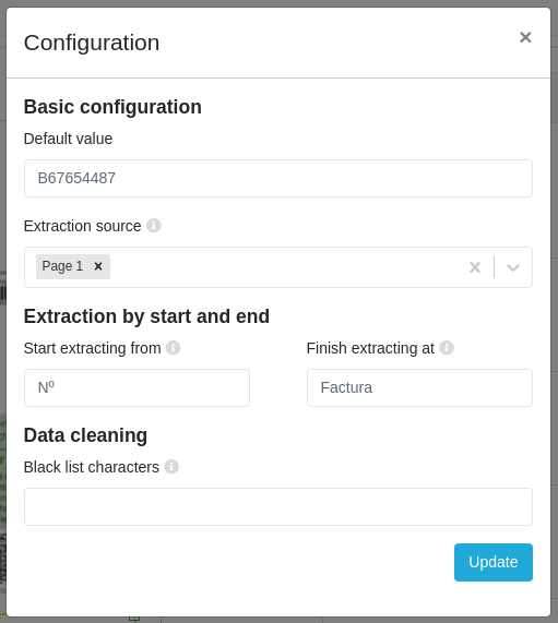 - Icono de la tuerca: te permite añadir un valor por defecto para el campo cuando sea clasificado con esta plantilla. Además, puedes añadir un texto para indicar donde comienza la extracción, y otro para marcar donde finaliza.