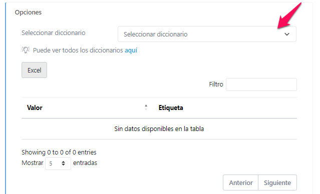 Posteriormente, aparecerá la sección de Opciones en la cual se podrá desplegar el diccionario correspondiente al campo que se está configurando: