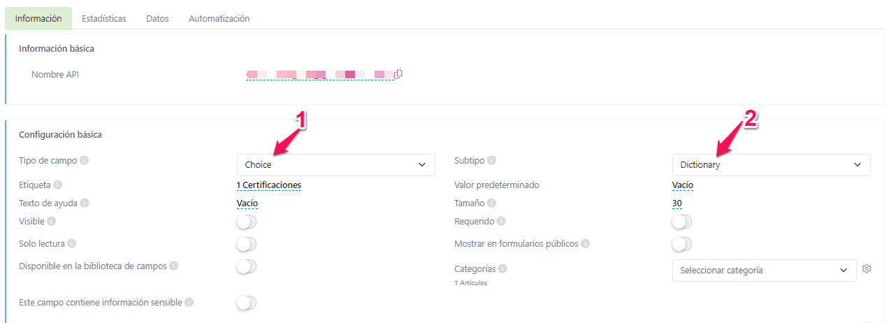 2. El subtipo de campo debe ser Dictionary/Diccionario
