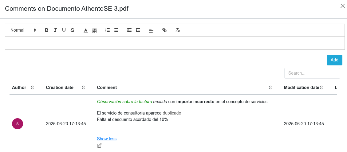 Athento permite editar tu propio comentario, en la tabla nos aparecerá un botón en el que podremos editar nuestro comentario, solo podremos editar nuestros comentarios. Si hemos editado el comentario en la lista de los comentarios nos indicará que ese comentario ha sido editado