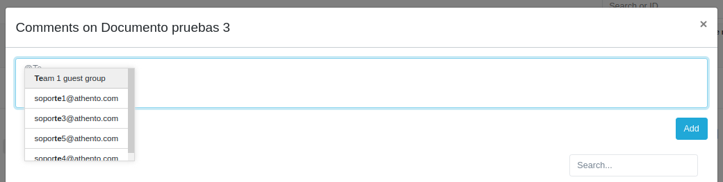 Para mencionar a un usuario o grupo, escribe '@' en el campo del comentario seguida de los primeros caracteres del nombre de usuario o nombre de grupo. A continuación, Athento te mostrará las coincidencias. Selecciona al usuario o grupo de la lista.