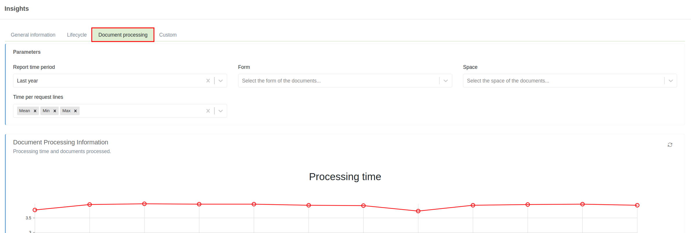 En la pestaña de procesamiento de documentos se pueden ver gráficas de tiempo de procesamiento y de documentos procesados. Además se pueden utilizar varios filtros y se pueden añadir más líneas a la gráfica de tiempo.