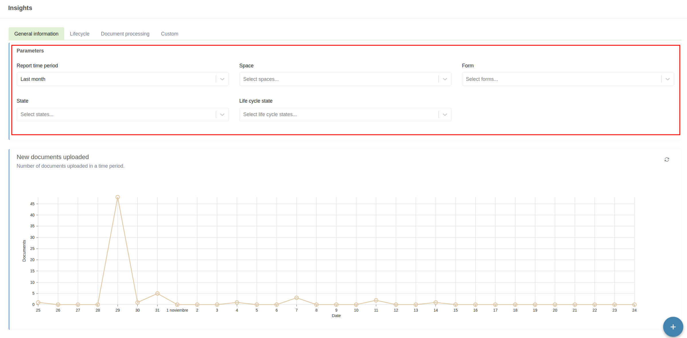 La gráfica de nuevos documentos subidos muestra los documentos creados según su fecha de creación en el periodo de tiempo seleccionado. Además también utiliza el resto de filtros.
