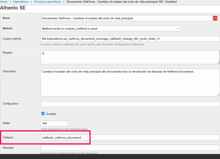 Adicionalmente, desde la administración avanzada de la operación, deberá añadirse la categoría callback_viafirma_document para que se ejecute la operación.