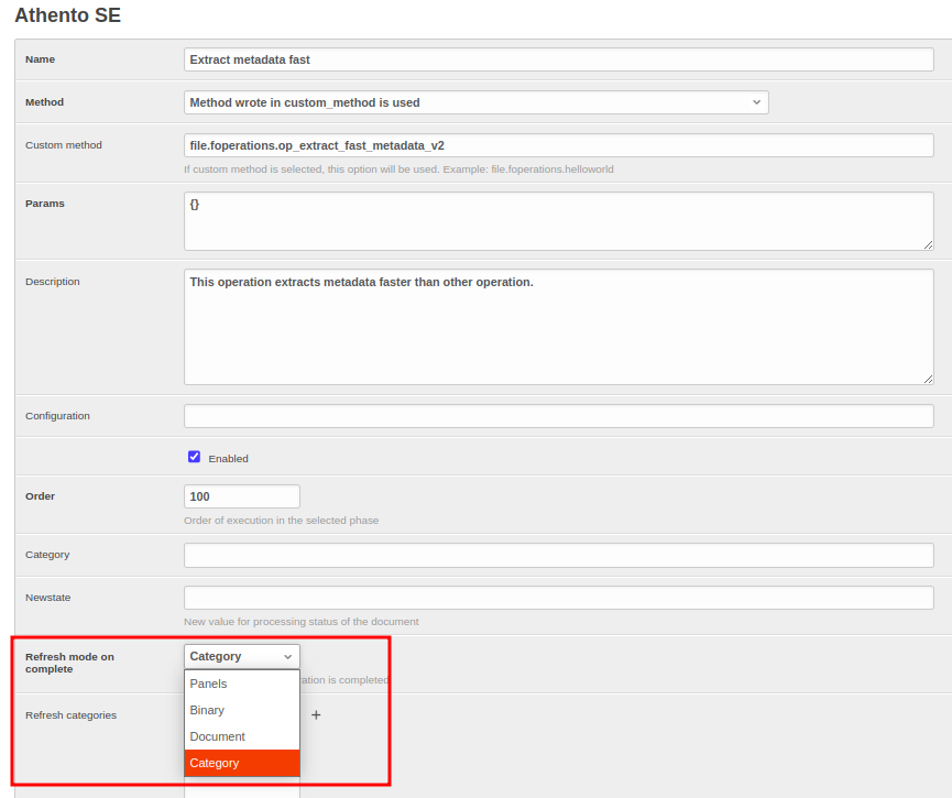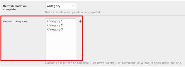 - Categoría (Category): para actualizar varias categorías. Para que esta recarga funcione correctamente, hay que configurar el campo "Refresh categories" y seleccionar las categorías que se van a refrescar.