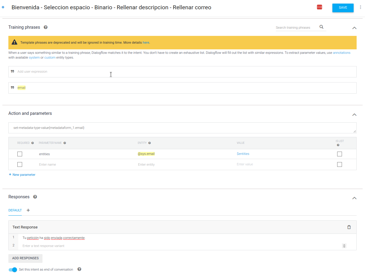 Intents metadata types: se utilizan acciones para rellenar los metadatos de descripción e email, siendo este último el final de la conversación. Si se utilizan entidades que no sean de tipo any (en este caso, sys.email) se deberá cambiar su "PARAMETER NAME" a la palabra "entities". Las que son any se pueden dejar tal y como están.