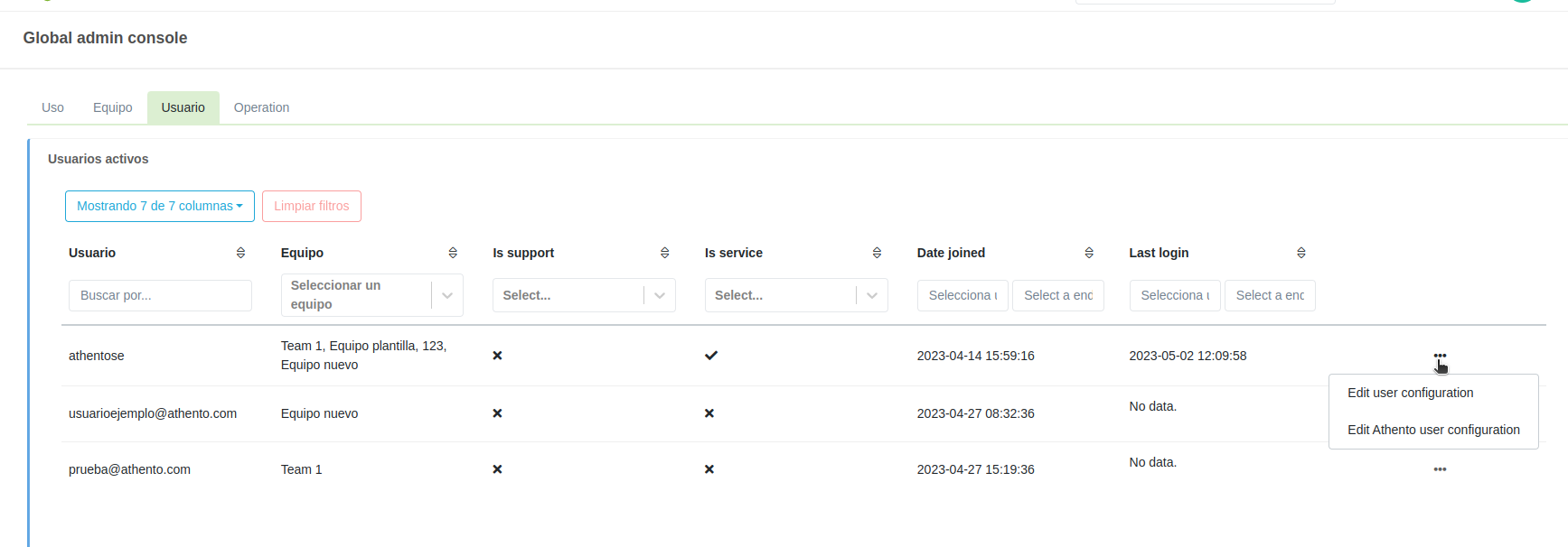 Desde la tabla de usuarios de la Consola de Administración Global, es posible editar cierta configuración de cada uno de los usuarios. Para ello, debes ir a la tabla y pulsar sobre el siguiente botón en el que, al pulsarlo, verás un desplegable con dos opciones, una para la configuración del usuario Django y otra para la configuración del usuario Athento.